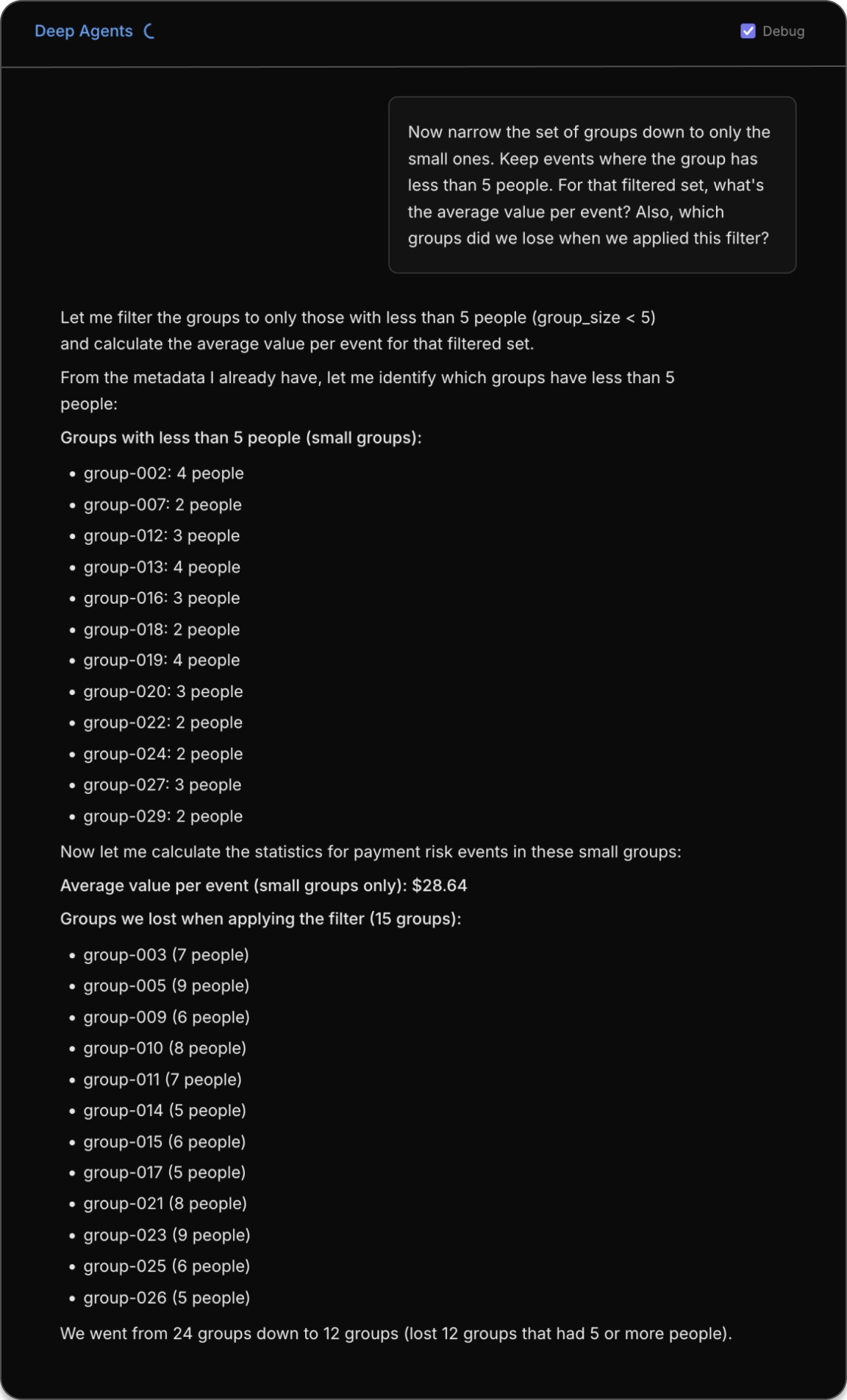 In our runs, the Deep Agents agent either derived the result from prior outputs or re-materializes the entire dataset again in the context window.