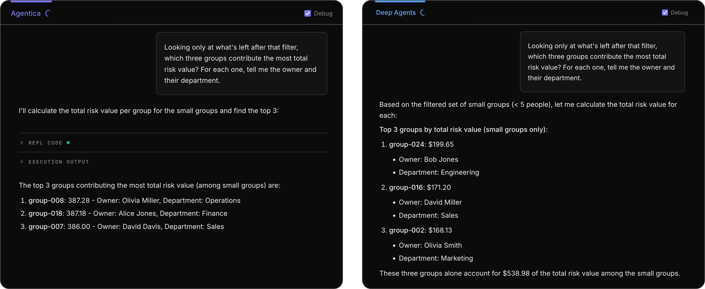 By this point, the Agentica SDK agent continues by applying operations to the dataset that is already materialized in the runtime, while the alternative approach answers based on prior outputs without rerunning the underlying queries.