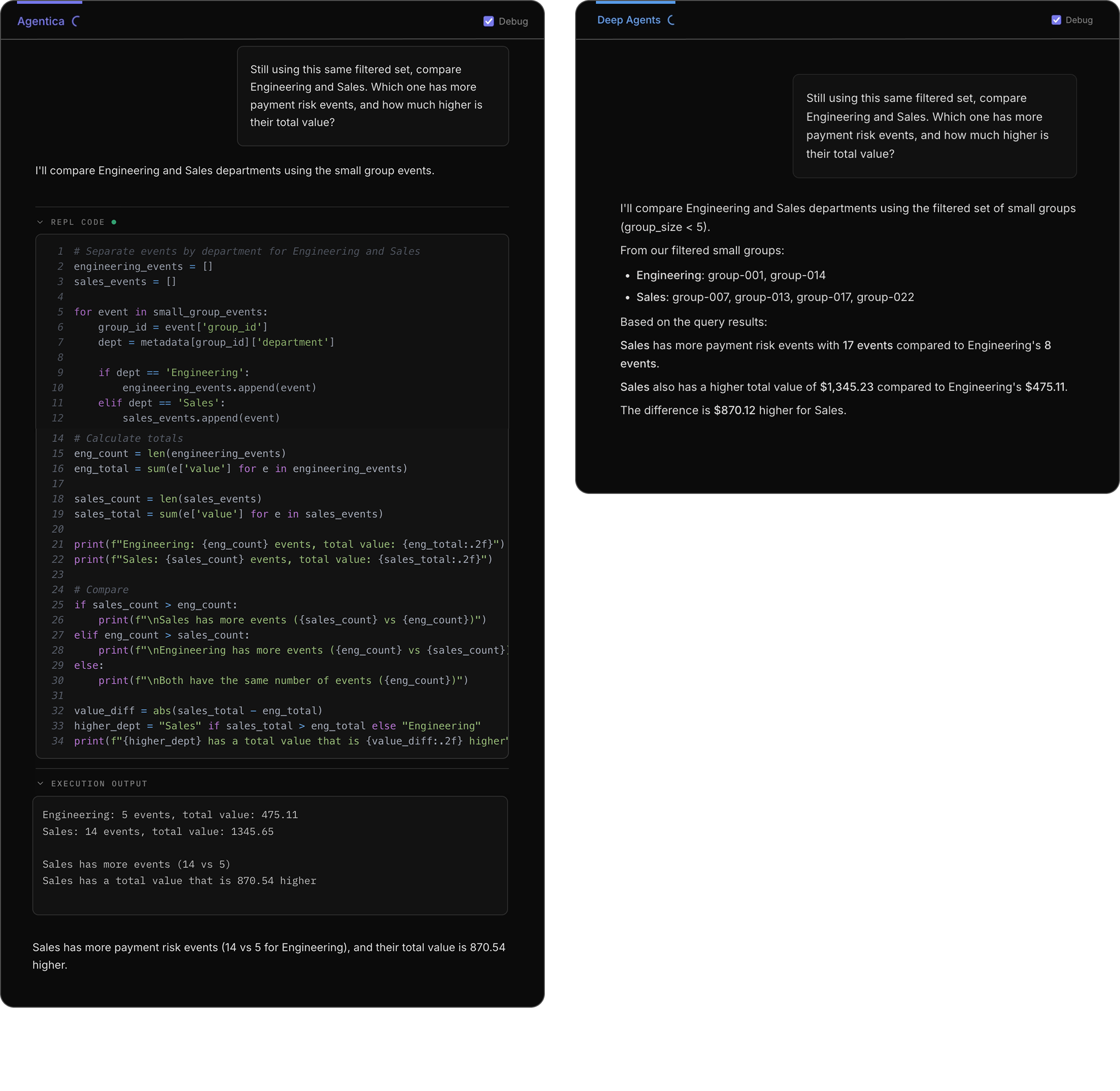 Demonstration of how the two agents perform tool calls to answer the question. The Agentica SDK agent uses the Python REPL and Deep Agents reads the result of its tool call.